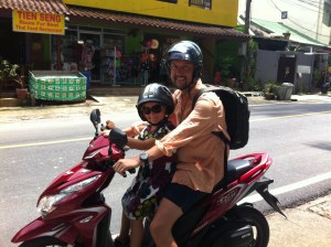 - Moped Adventures: I decided that 10 years was sufficiently long to banish the emotional scars inflicted from riding backseat on J’s moped in Bermuda. That, and the recognition that he values Z’s life more dearly than mine (or, as he explained it, feels more responsible for her–we can take that up another time). So we rented a moped in town and did it Thai style–3 astride, with Z in the front, Jonathan in the driver’s seat and me holding up the rear (fortunately not having to hang on for dear life this time). The first afternoon we headed north towards Mai Khao Beach for lunch, which we found almost nonexistent (not the beach, just the lunch in town)–we later learned that there is another part of town that is more developed. With plans of lunch on hold, we stopped at a wat (temple) down a dirt road and had a lovely little ride through Casaurina-lined streets until we came across a herd of water buffalo and I immediately thought of Pamplona’s bulls. By that time we were shaky with hunger and a bit unsettled about finding ourselves on a busy main road with trucks barreling by at 60 MPH.