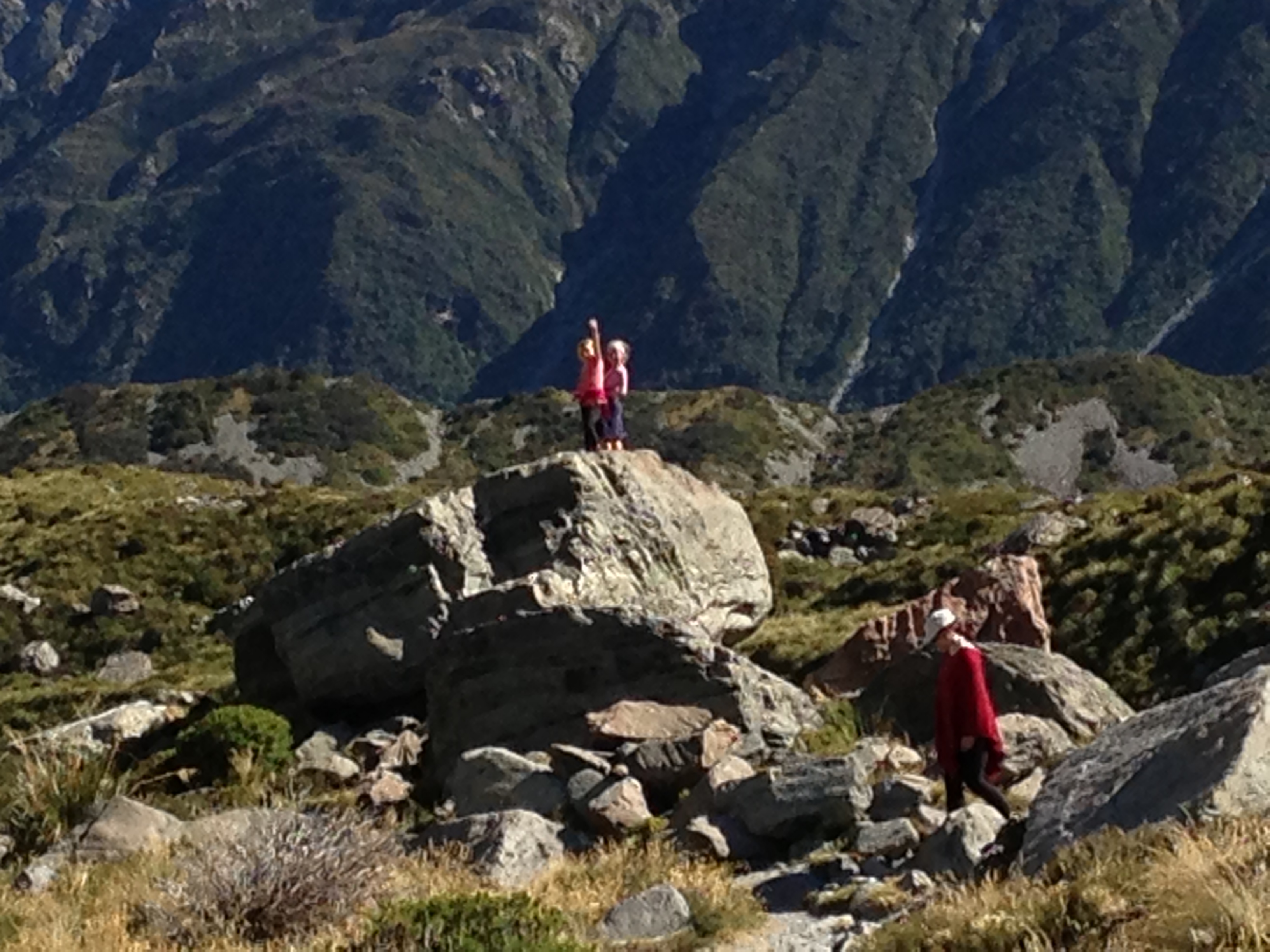 Just minutes before we’d been watching Z and her new 6-year old German friend scamper up the boulders scattered along the shores of Lake Hooker and the banks of the rumbling clay-colored river that the lake fed, overlooked by the majestic Mt. Cook and the Hooker Glacier. As their confidence grew, the size of the boulders they tackled increased. We had JUST expressed some minor reservations about their safety as we noticed them dancing upon the top of their largest boulder yet, but agreed that they were “cautious girls” and the day felt too perfect for worry. It was a rare cloudless day for the region and the hot weather offered a picture perfect hike to the glacier view. We even were fortunate enough to witness two minor avalanches in the distance, alerted to their presence by cracking booms echoing across the valley. I felt that the hike’s reputation as one of the world’s best was well-justified, even in a land where grandiose beauty seems a common commodity.