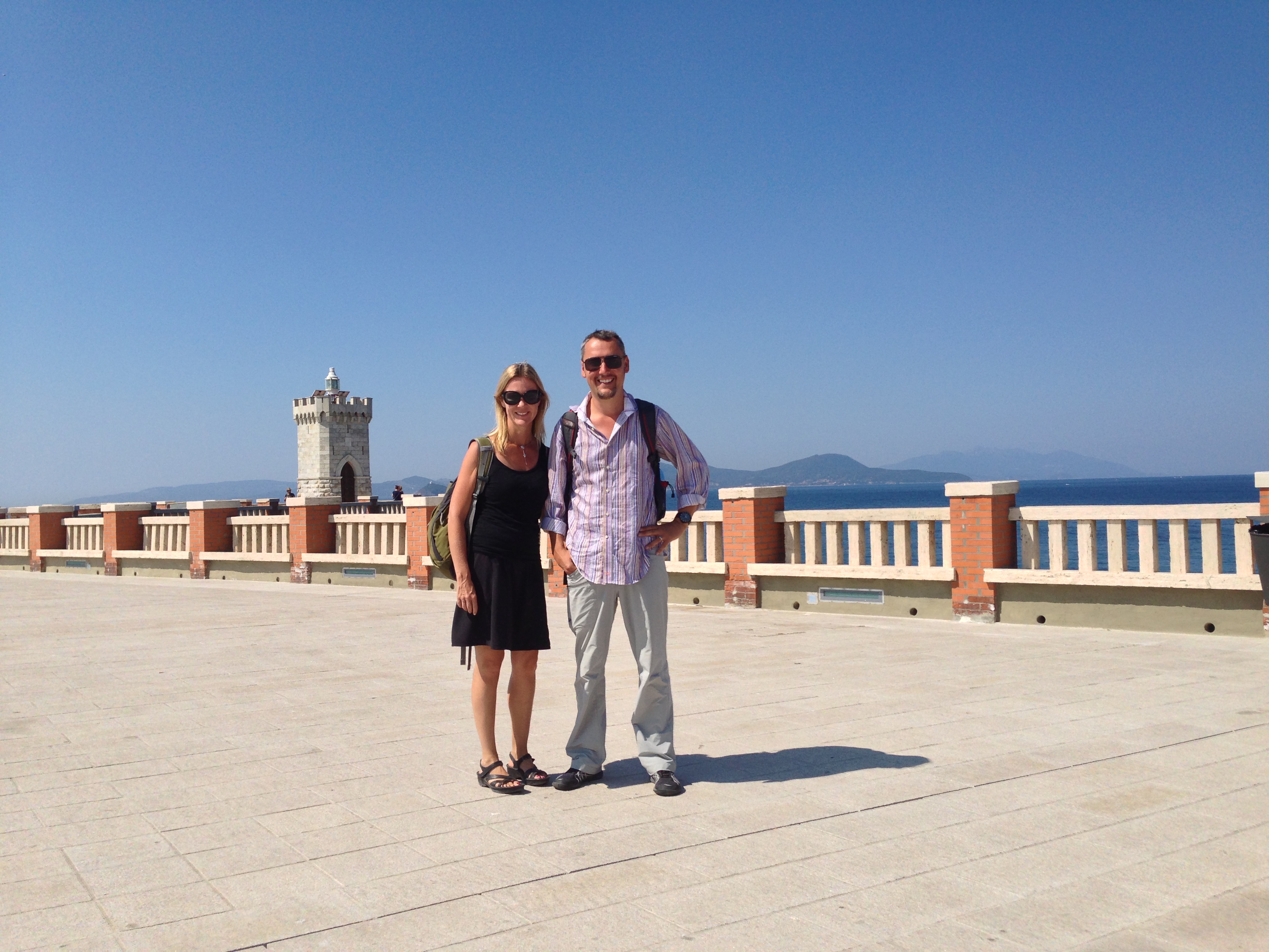 As we headed north the next morning, we stopped for coffee in the seaside town of Piombino, where we could see Elba in the “not far enough” distance. (I hadn’t appreciated how close to shore Elba is and it clearly wasn’t remote enough for Napoleon’s exile.) After we fueled up, our next stop was Pisa and its leaning tower. The contrast to the Etruscan Necropolis couldn’t have been greater, with busloads of tourists and day-trippers from Rome. Still, it was surprisingly cool to see in person. Interestingly, we learned that when Jonathan visited in 1988, it had leaned nearly twice as much as it does now, as they closed it in 1991 for about eight years to stabilize the tower after another one nearby unexpectedly toppled and the stabilization included some necessary straightening but not enough to take away the tourism appeal!
