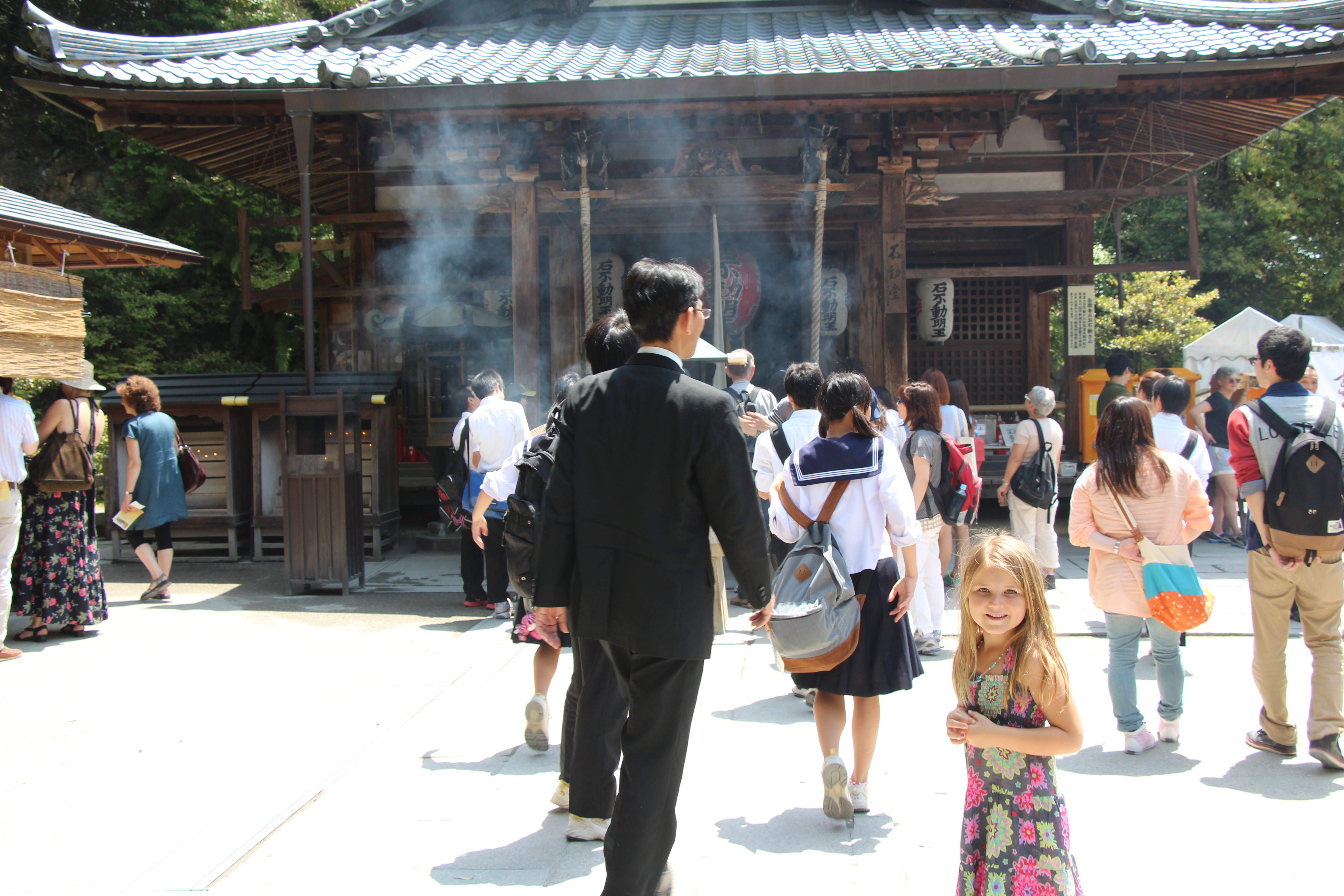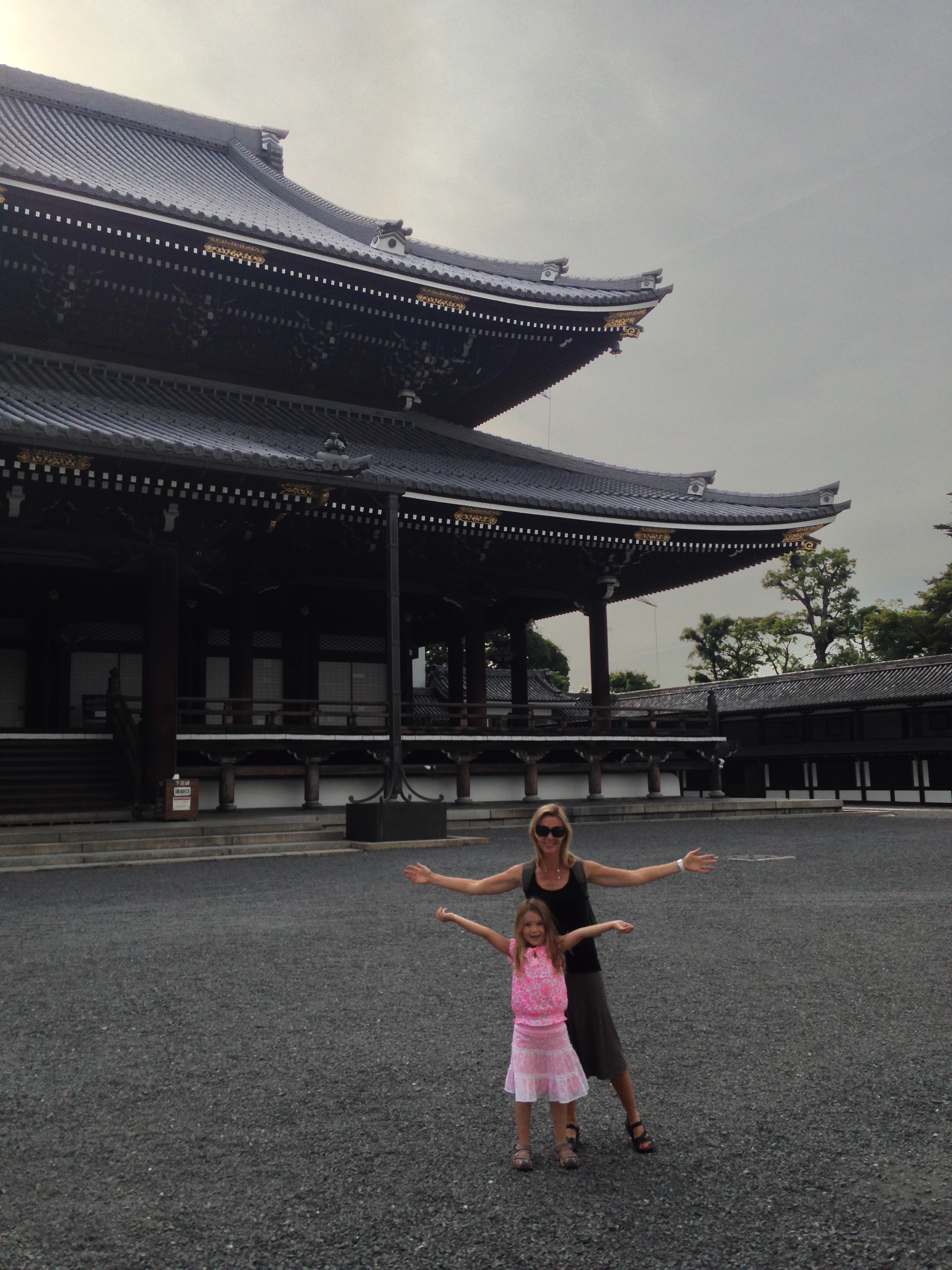 Fortunately, Nara had a lot more to offer than just deer, as there are seven main temple complexes. We stopped first at Katsuga Shrine and Nigatsu-dō and then headed to the famous Todai-ji, whose great Buddha Hall was initially constructed in 752 but has been rebuilt twice due to fire (a common hazard with Japan’s wooden structures). The hall was the largest wooden structure in the world until 1998 and houses a massive statue of the “Cosmic Buddha”. It also has a wooden beam with a hole in it that is purportedly the same size as one of the Buddha‘s nostrils. There was a long line to crawl through the hole, as legend has it that those who pass through it will be blessed with enlightenment in their next life. Zara made it through but Jonathan wisely declined after seeing a Japanese pre-pubescent teen almost get stuck. (Jonathan reports having done it 20 years earlier so he’s already set for his next life.)